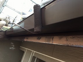 防水機能が低下し始め、窓枠まわりに水染みが見られます。