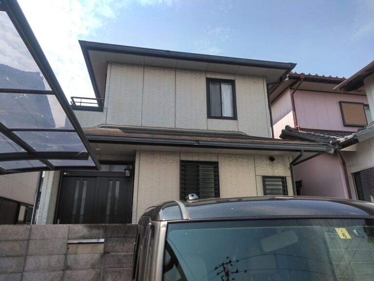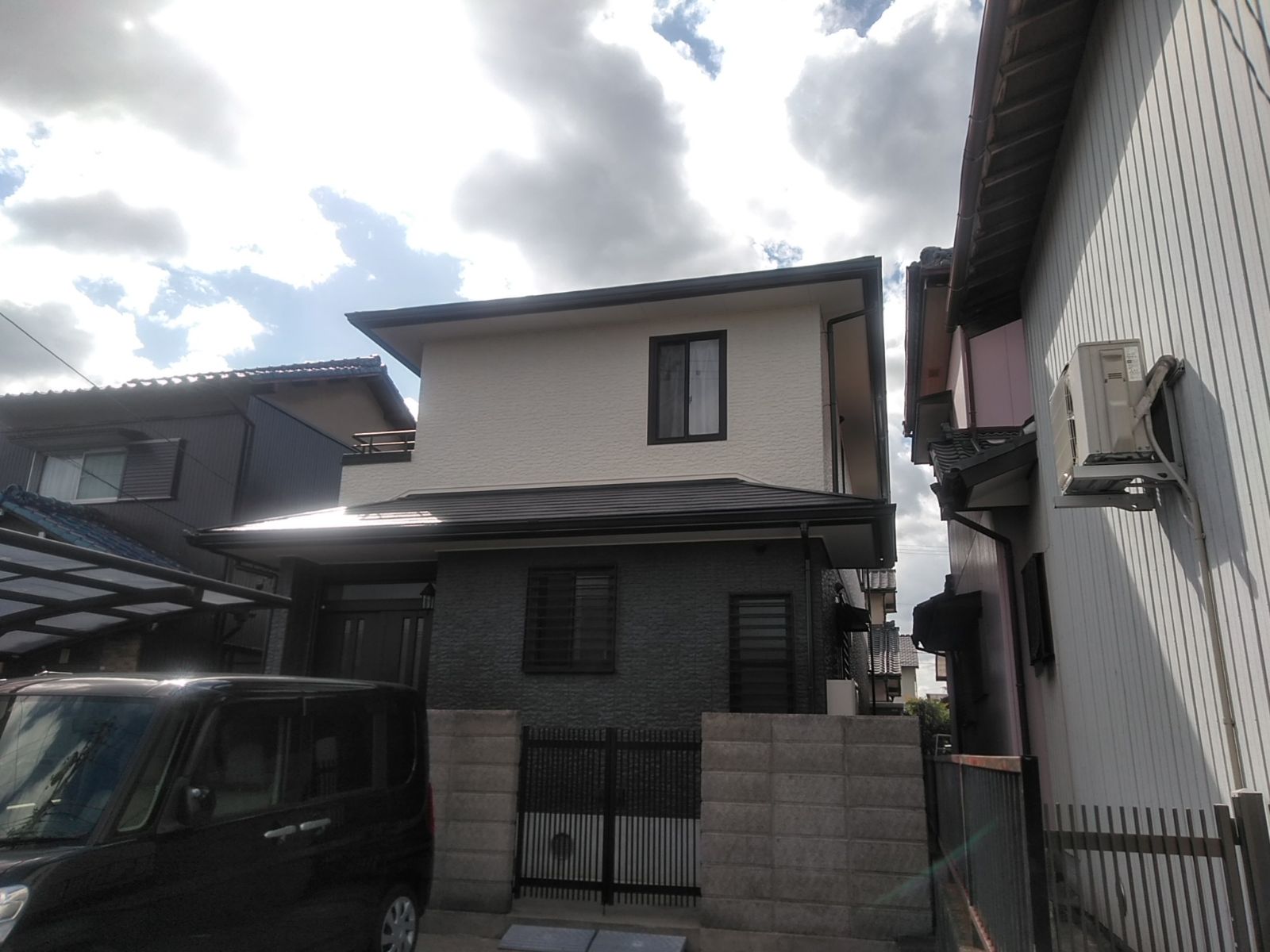 塗装前はグレーで1色の外壁でしたが、外壁の真ん中の、帯の部材で塗り分けができることをお伝えしましたら、施主様もそれなら是非にとツートンカラーを考えてくださいました。今までの施工事例やシミュレーションをお見せして ご相談に乗り、明るいクリーム~白色の2階と、濃いグレーの1階で素敵に仕上がりました!