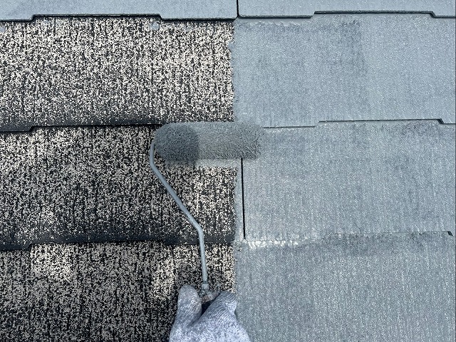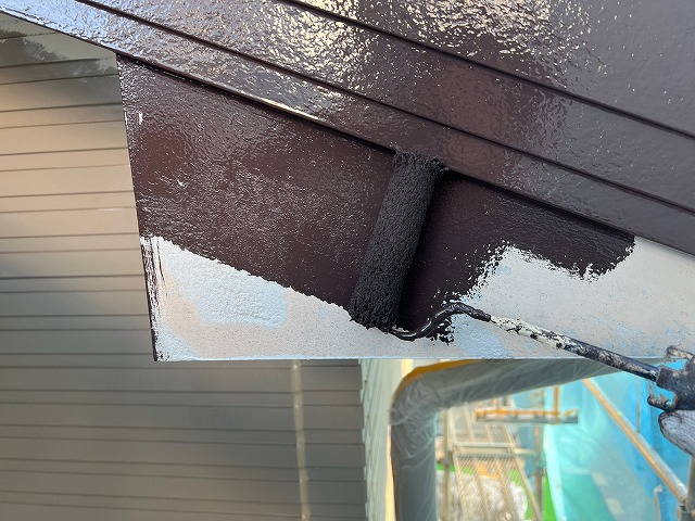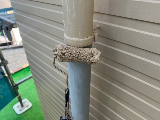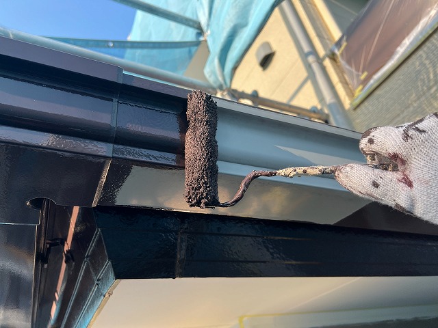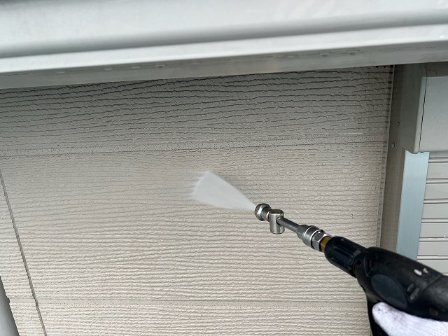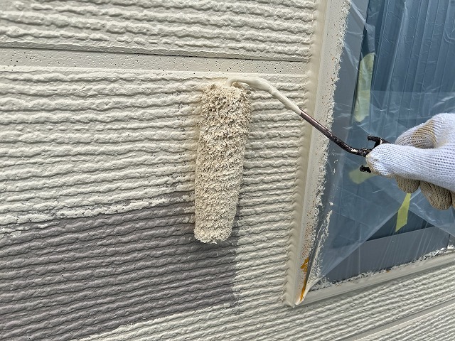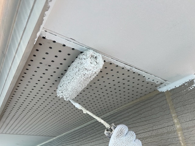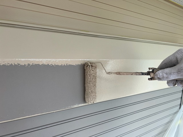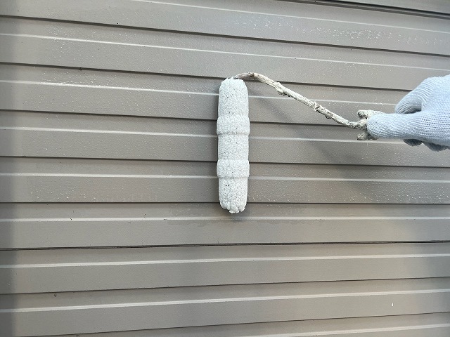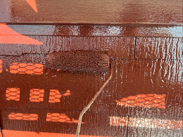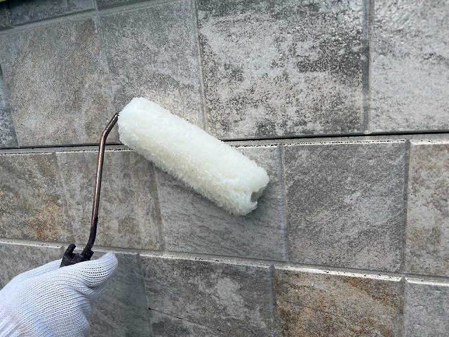 クリヤー塗装下塗り 玄関周りの意匠サイディングは、模様を残すためにクリヤー(透明の)塗装を施しました。