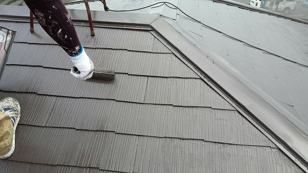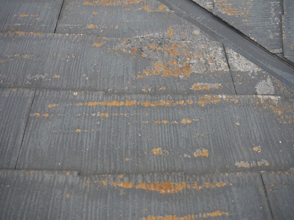 屋根の塗装が劣化し、剥離や苔の発生があります。