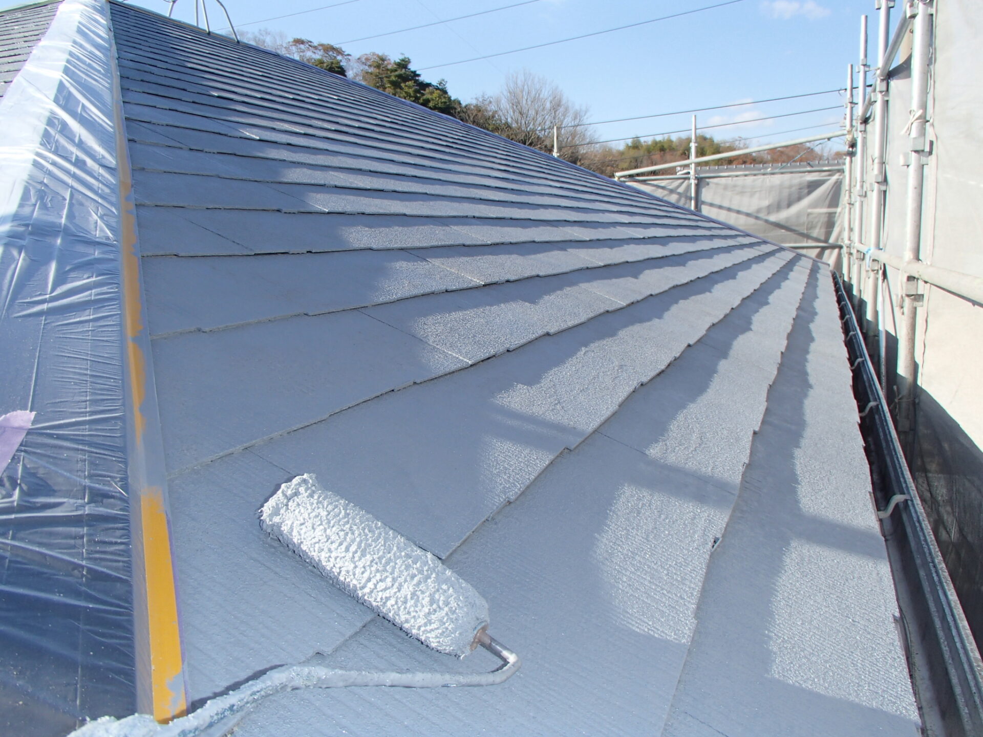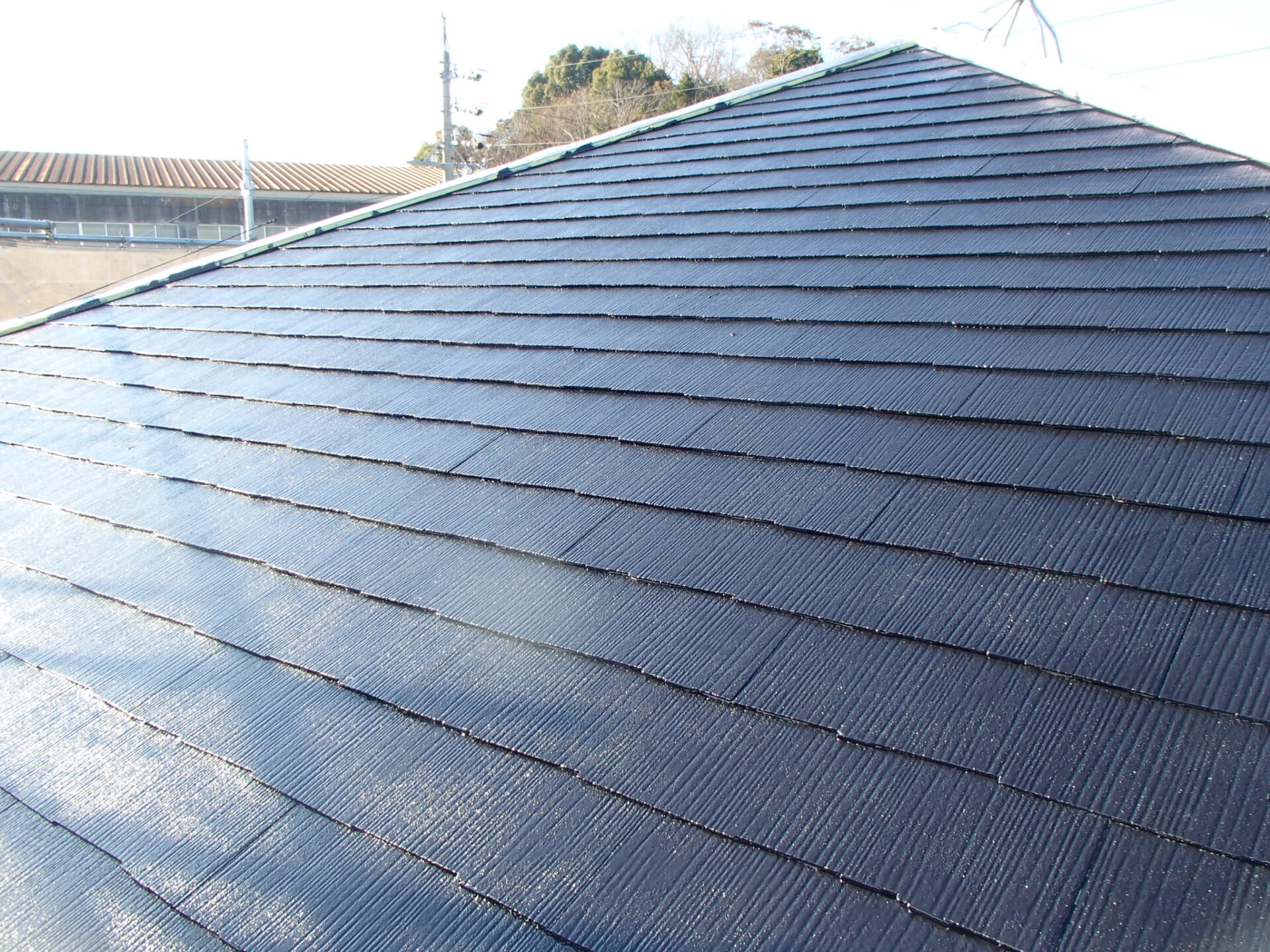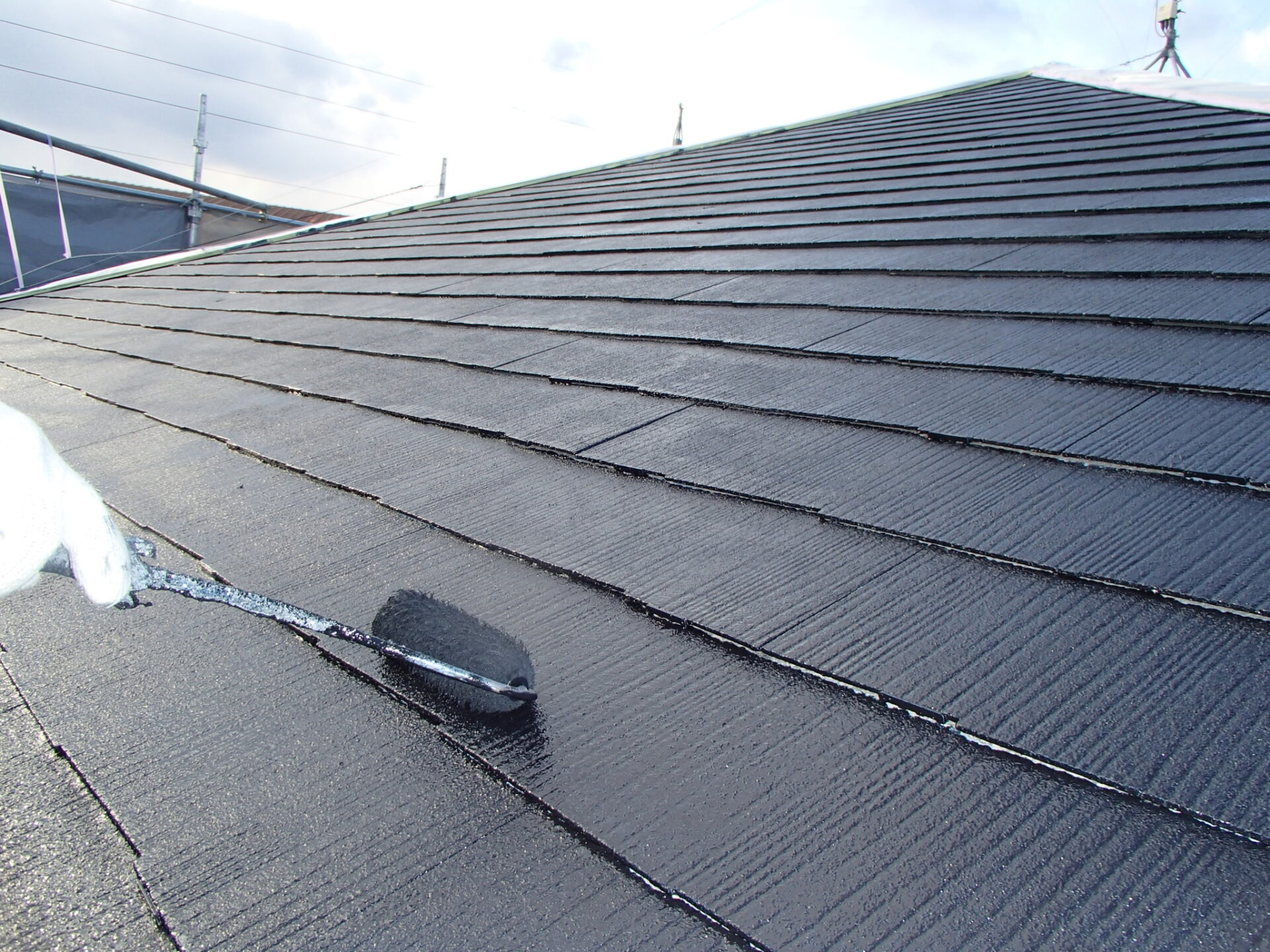屋根の棟板金の修理工事をした後、スレート瓦に塗装をしました。