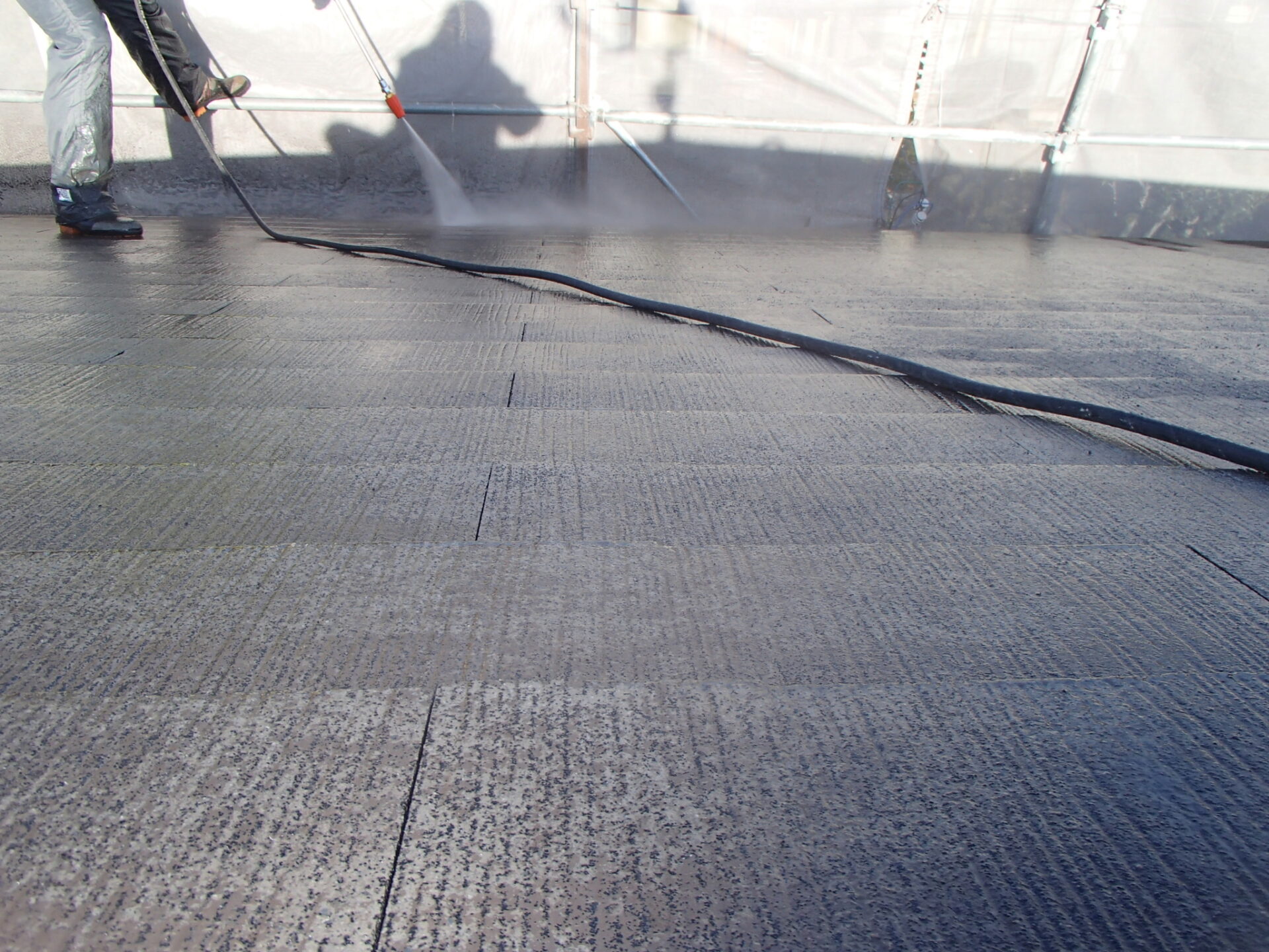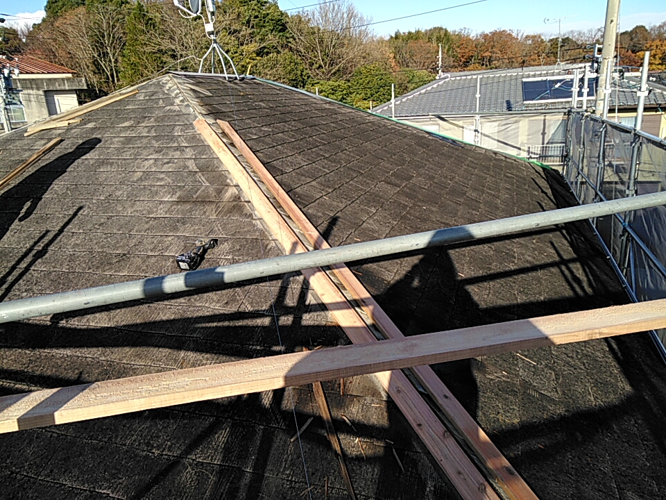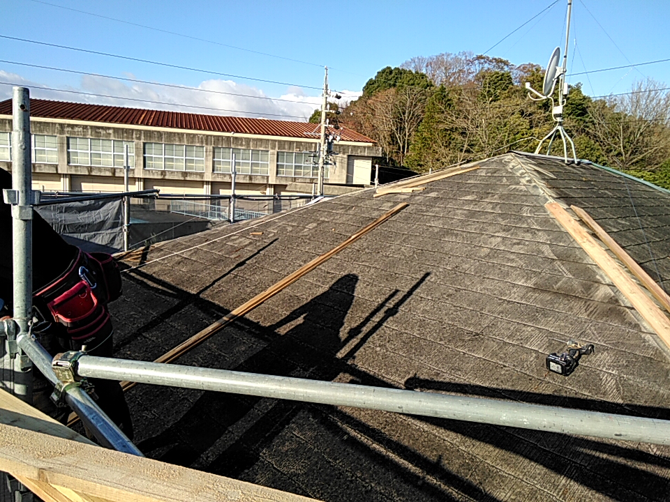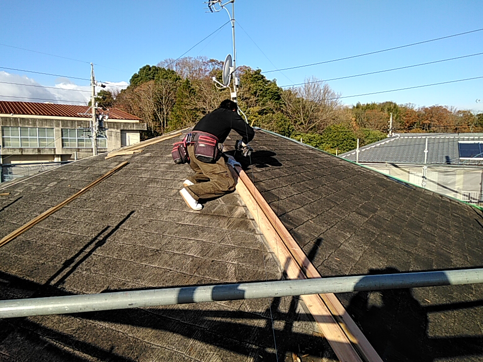 屋根の棟板金の修理工事をした後、スレート瓦に塗装をしました。
