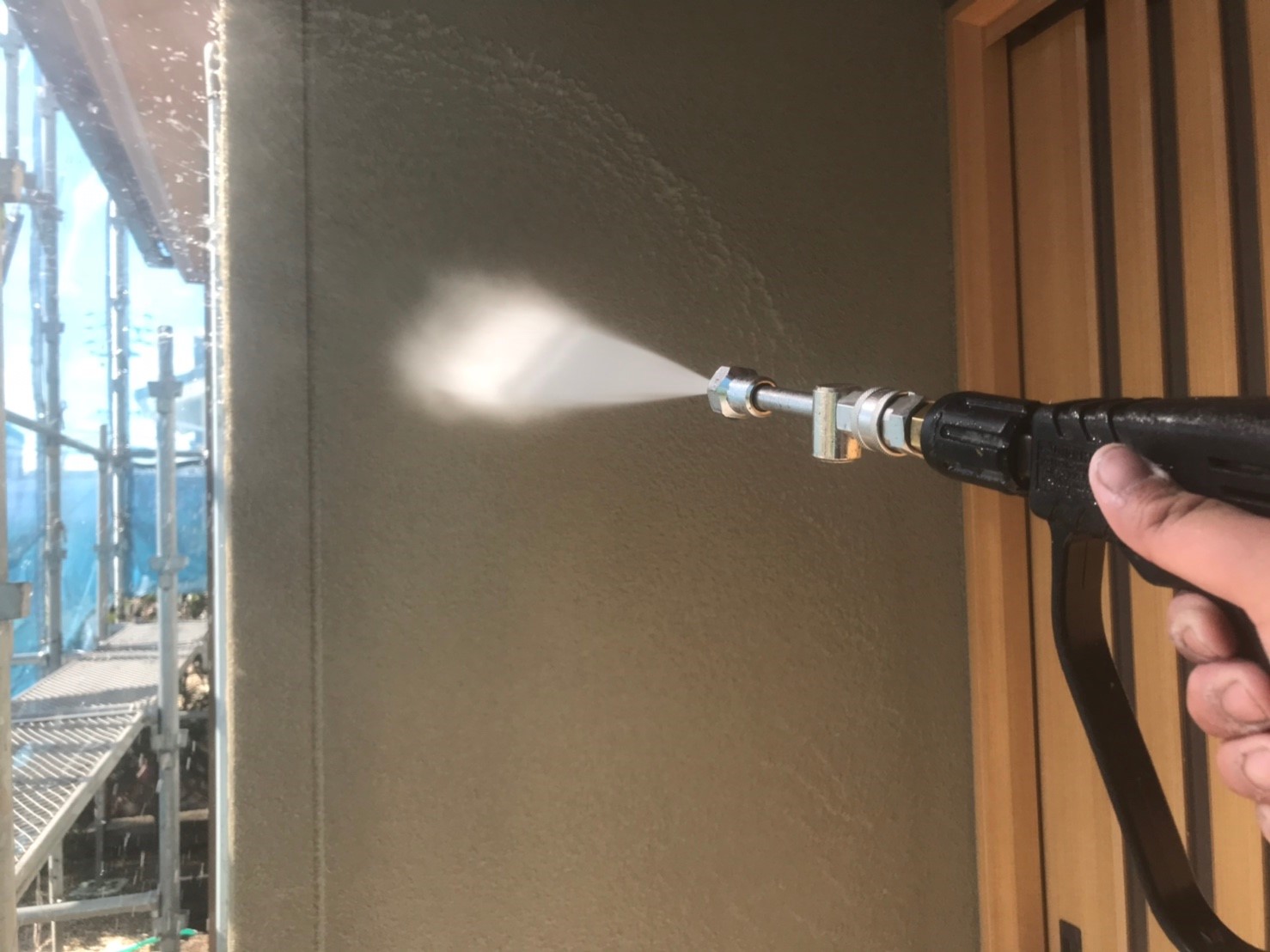 塗装前に、高圧洗浄で外壁の汚れをしっかり取ります。