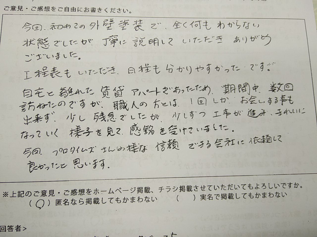 今回、プロタイムズさんの様な信頼できる会社に依頼して良かったと思います。