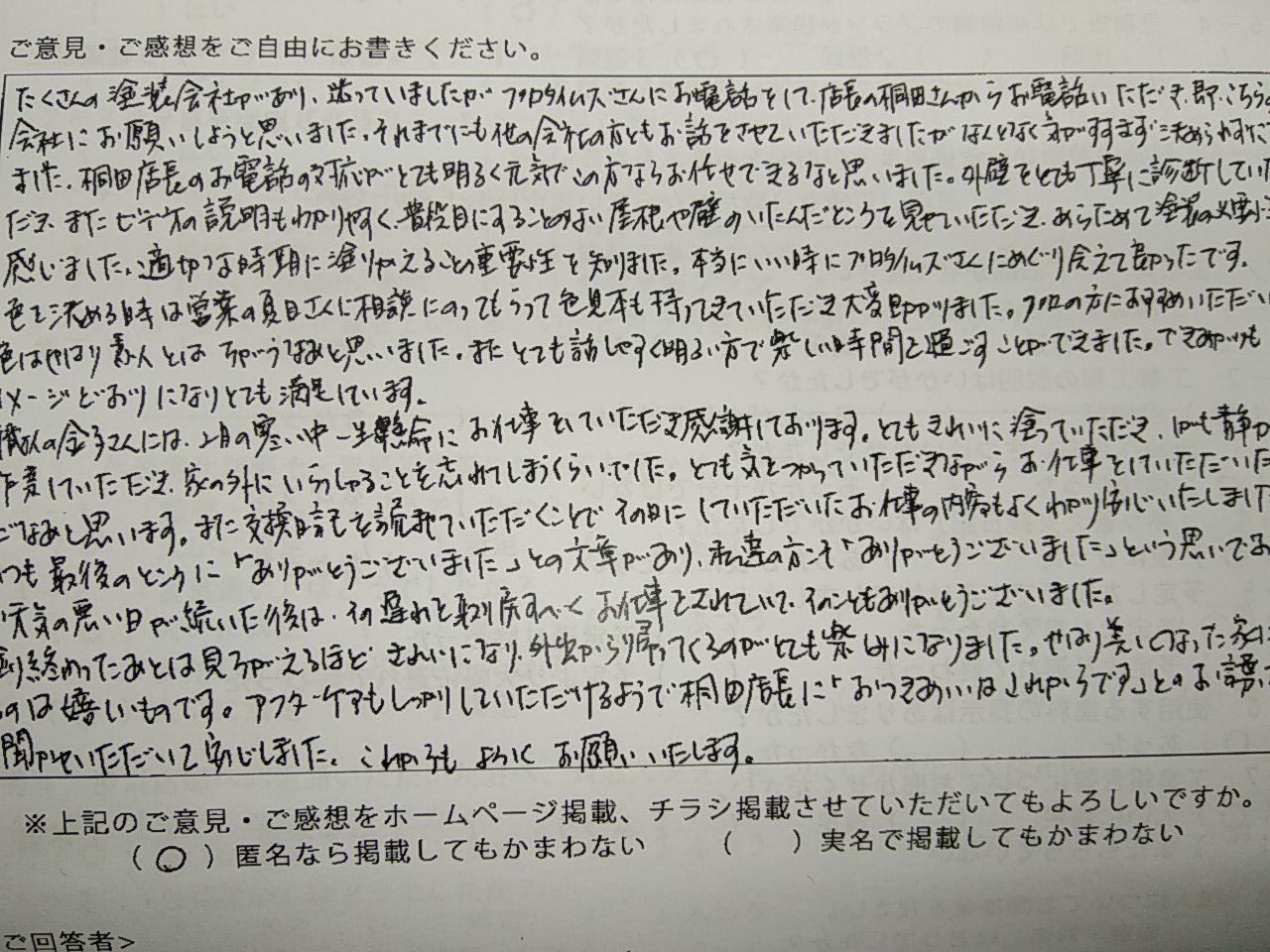 たくさんの塗装会社があり、迷っていましたが、プロタイムズさんにお電話をして、店長の桐田さんからお電話いただき、即こちらの会社にお願いしようと思いました。それまでにも他の会社の方ともお話をさせていただきましたがなんとなく気がすすますに決められずにおりました。桐田店長のお電話の対応がとても明るく元気でこの方ならお任せできるなと思いました。外壁をとても丁寧に診断していただき、またビデオの説明もわかりやすく、普段目にすることのない屋根や壁のいたんだところを見せていただき、あらためて塗装の必要性を感じました。適切な時期に塗りかえることの重要性を知りました。本当にいい時にプロタイムズさんにめぐり会えて良かったです。
