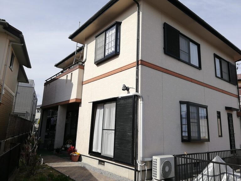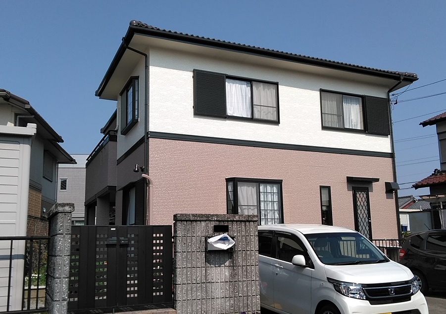 前回塗装をされてから10年以上が経過しており、屋根・外壁ともに塗料の色褪せや剥がれが始まっていました。耐久性に優れた塗料でしっかり防水を効かせるとともに、今回はツートンカラーにしてみたいというご夫婦のご要望のもと、配色をし、いい色合いになったとご満足いただくことができました(^^)