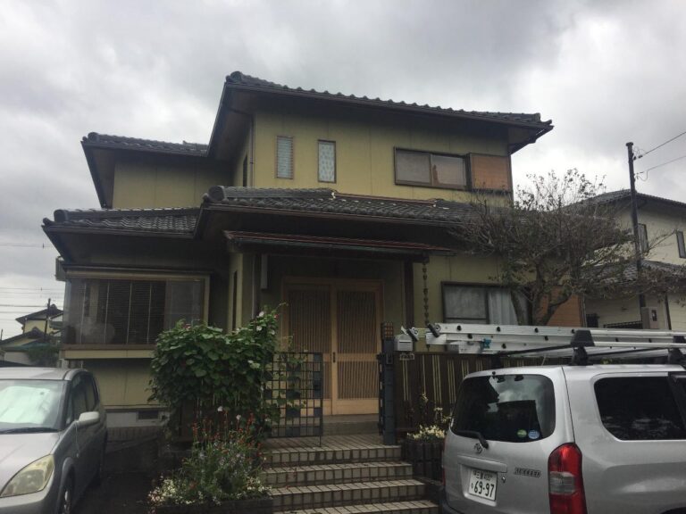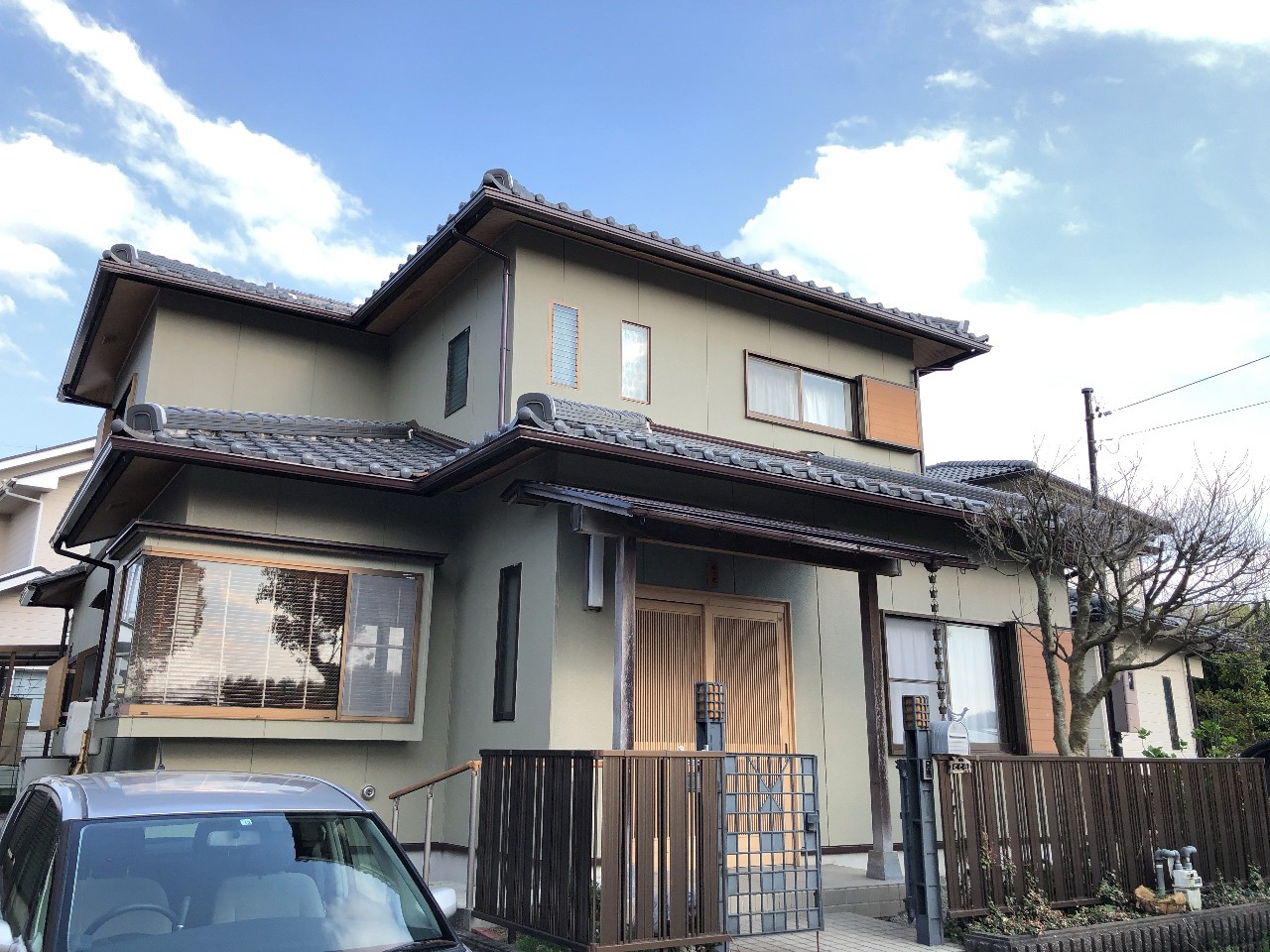 建てられてから年数が経っており、外壁の新築時の塗膜劣化や反り、また屋根瓦の漆喰の劣化が見られましたので、メンテナンスをさせていただきました。和風のお家によく合うよう、緑色系の塗料で塗装を施し、落ち着いた仕上りになりました!