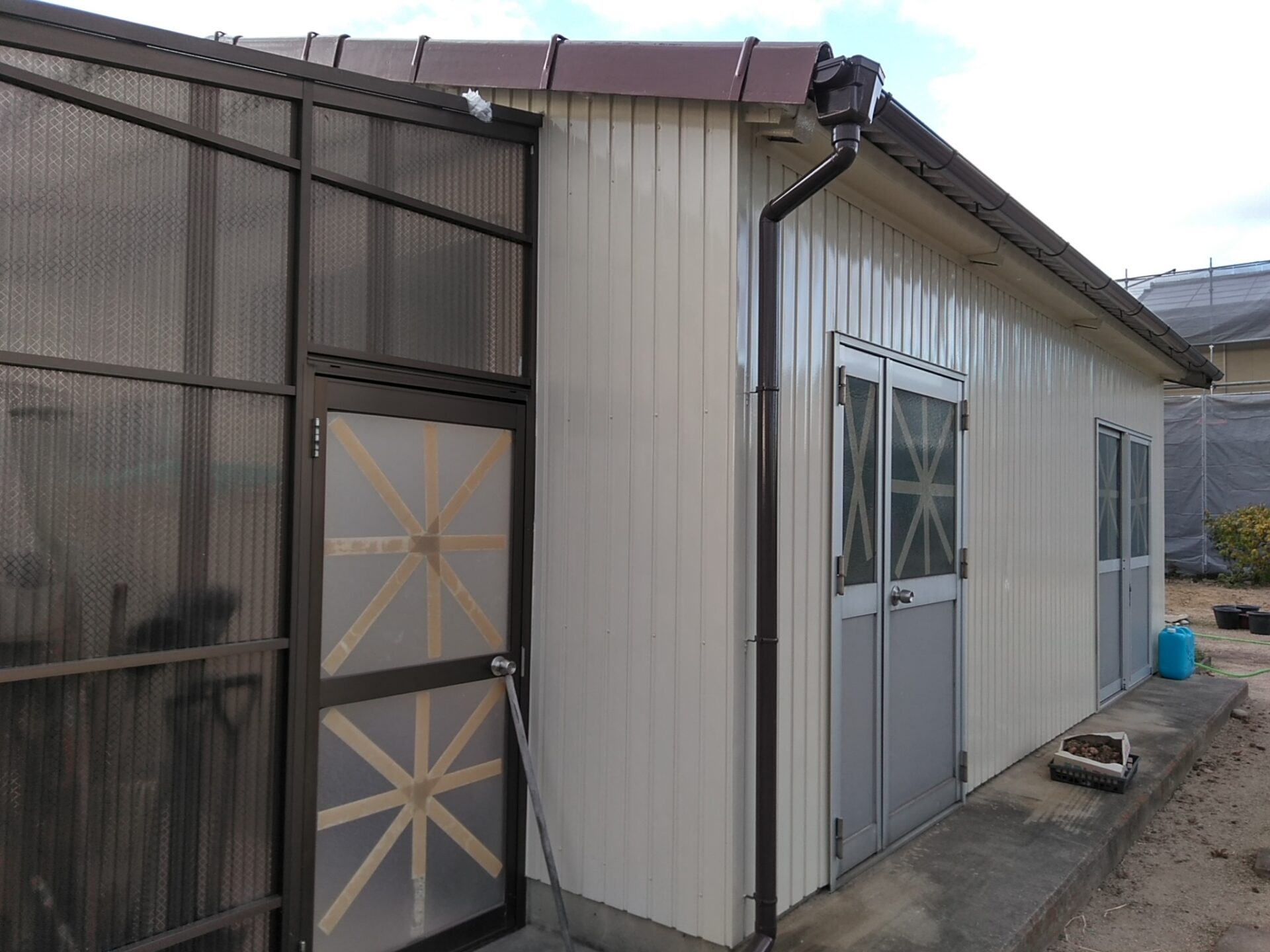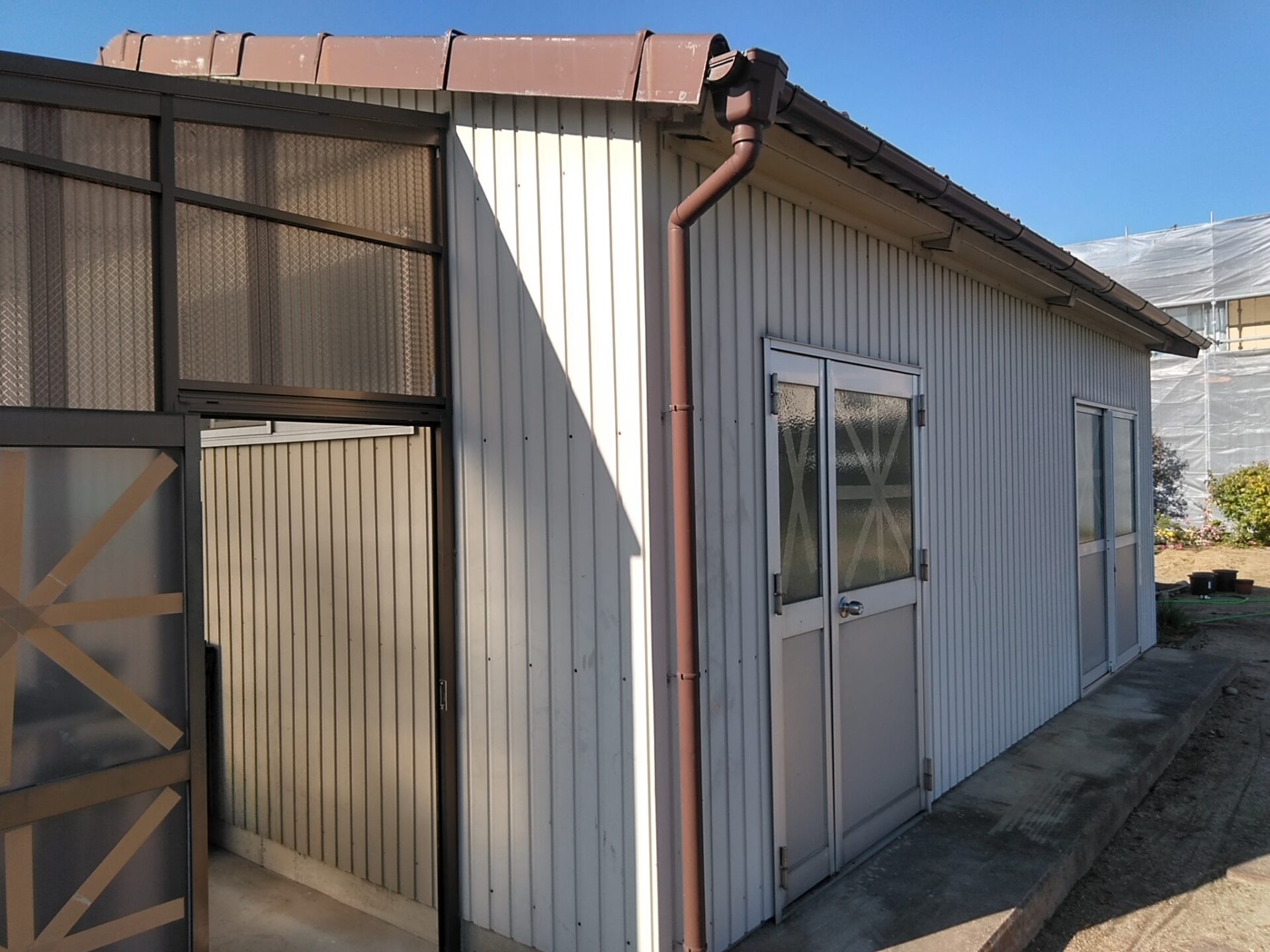 建てられてから年数が経ち、外壁や雨戸などの塗膜が劣化し始めておりました。母屋と同時に敷地内の倉庫も塗装でメンテナンスさせていただき、ご安心いただきました。