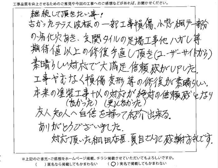 古かったテラス波板の一部工事損傷、小窓網戸一部分の劣化穴あき、玄関タイルの足場工事他ハガレ等 期待値以上の修復手直し頂き(ユーザーサイドから)素晴らしい対応で大満足 信頼感がUPした。
