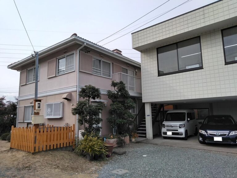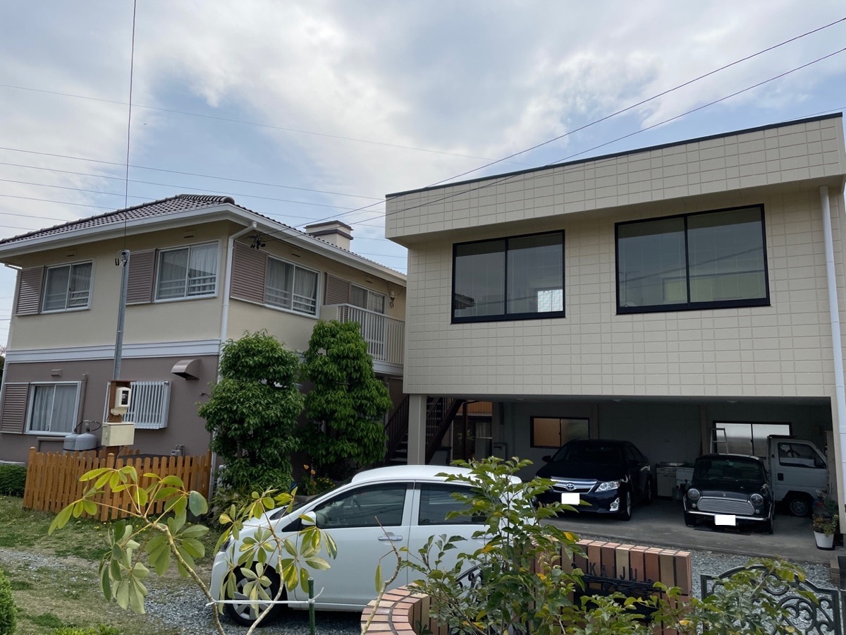 左に建っているご自宅と、右に建っている事務所を2棟同時に施工させていただきました。ご自宅屋根のモニエル瓦や、事務所外壁のALCなど、仕様に注意が必要な建材でしたのでしっかり塗布量を確保して塗装させていただき、施主様にご安心いただくことができました!