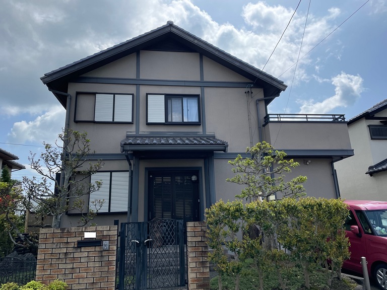 建てられてから年数が経ち、外壁のひび割れが気になり始めたということで、今回のメンテナンスを担当させていただきました。新築時から吹き付け・艶消しの落ち着いた外観でしたので、そのイメージを崩さないよう、今回も艶消し塗料で塗装を施し満足してくださいました!